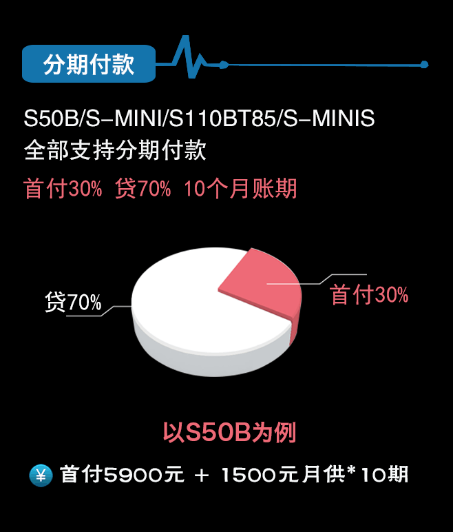 S50B/S-MINI/S110BT85/S-MINIS全部支持分期付款首付30% 貸70% 10個(gè)月賬期以S50B為例首付5900元 + 1500元月供*10期